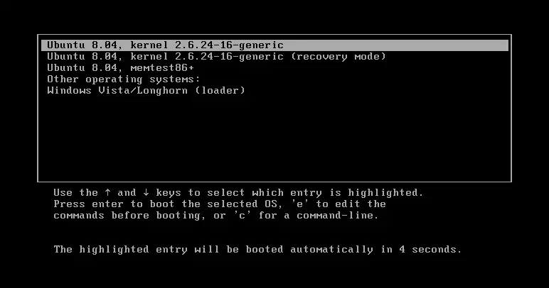 Mỗi lựa chọn trong GRUB bootloader có thể là: 1 phiên bản kernel Linux khác, 1 phiên bản kernel Linux ở chế độ phục hồi hoặc 1 bản phân phối Linux khác (vd Ubuntu, FreeBSD, Debian, CentOS) hoặc Windows, BSD. Bạn có thể ấn phím E để chỉnh sửa câu lệnh sẽ được chạy khi chọn lựa chọn hiện tại trong menu GRUB (bao gồm các tham số cho nhân hệ điều hành).